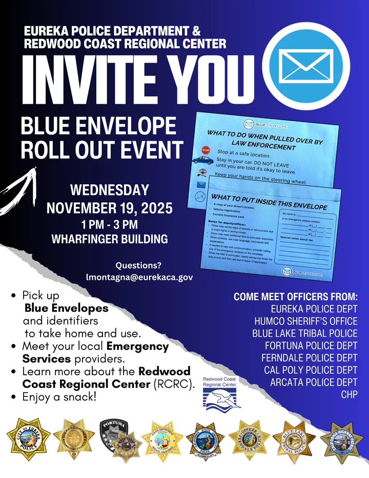 The Eureka Police Department, in collaboration with the Redwood Coast Regional Center, is proud to host a regional Blue Envelope Program event designed to improve communication and understanding between law enforcement and drivers on the autism spectrum or with other communication differences.