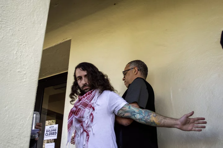 Richard Toledo prevents Michael Moore from stopping a protestor bringing food inside Nelson Hall Friday. Cal Poly Humboldt officials accused Toledo of assaulting the man in court declarations and a student suspension notice following the incident. Photo: Dezmond Remington