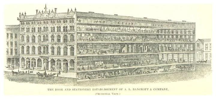 The A.L. Bancroft print factory on San Francisco’s Market Street. Image: Public domain, via Wikimedia Commons