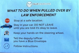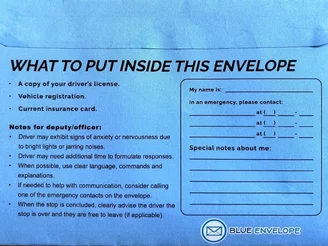 The Blue Envelope Program provides a simple, effective tool to make traffic stops and other encounters safer, calmer, and more understanding for everyone involved. Participants receive a blue envelope to hold essential documents such as their driver’s license, registration, and insurance. The envelope may also contain emergency contact details and information about the driver’s communication needs. When presented to an officer, the envelope discreetly signals that the person may have a communication disability or condition requiring additional time or a different approach. The envelope also includes tips and reminders for officers to help guide the interaction.