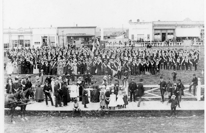 Gathering of the International Order of Odd Fellows in the Arcata Plaza, 1888, with white rail fence and wooden sidewalk. All photos are public domain; captions and photos from application.
