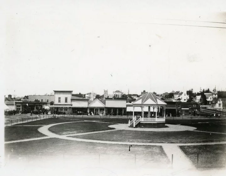 A photo of a long-gone bandstand and graveled walkways in the Plaza from 1888.