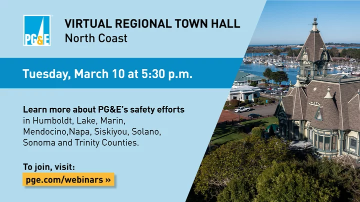 PG&E’s North Coast representatives will hold a virtual town hall at 5:30 p.m. on Tuesday, March 28, to answer questions about the new rate changes, discuss the winter storm response and provide more information about upcoming reliability upgrades. The event is for Humboldt, Lake, Marin, Mendocino, Napa, Siskiyou, Solano, Sonoma and Trinity county residents. Details can be found here.