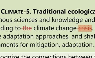 So why are environmental groups upset? Because, for one thing, the new draft of the RTP eliminates every prior instance of the phrase “climate crisis.” As shown in the image above, each reference to “crisis” has been crossed out and replaced with “change.”