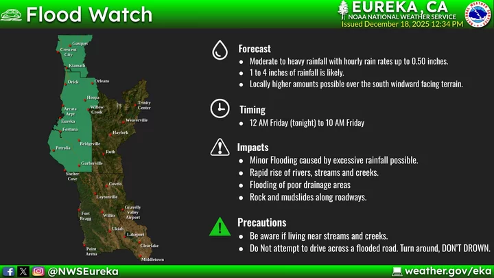 Forewarned is forearmed: Our friends at the National Weather Service office on Woodley Island are saying that there’s gonna be a hellacious front striking Humboldt at about midnight tonight, and it’s going to dump rain until about 10 a.m.