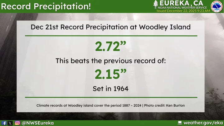 Dec. 21 has never been so wet! Our friends at the National Weather Service (NWS) office in Eureka say Sunday’s deluge broke the Dec. 21 rainfall record on Woodley Island with 2.72 inches of rain. The last time it rained that much on Woodley Island — or nearly that much — was during the Christmas Flood of 1964.