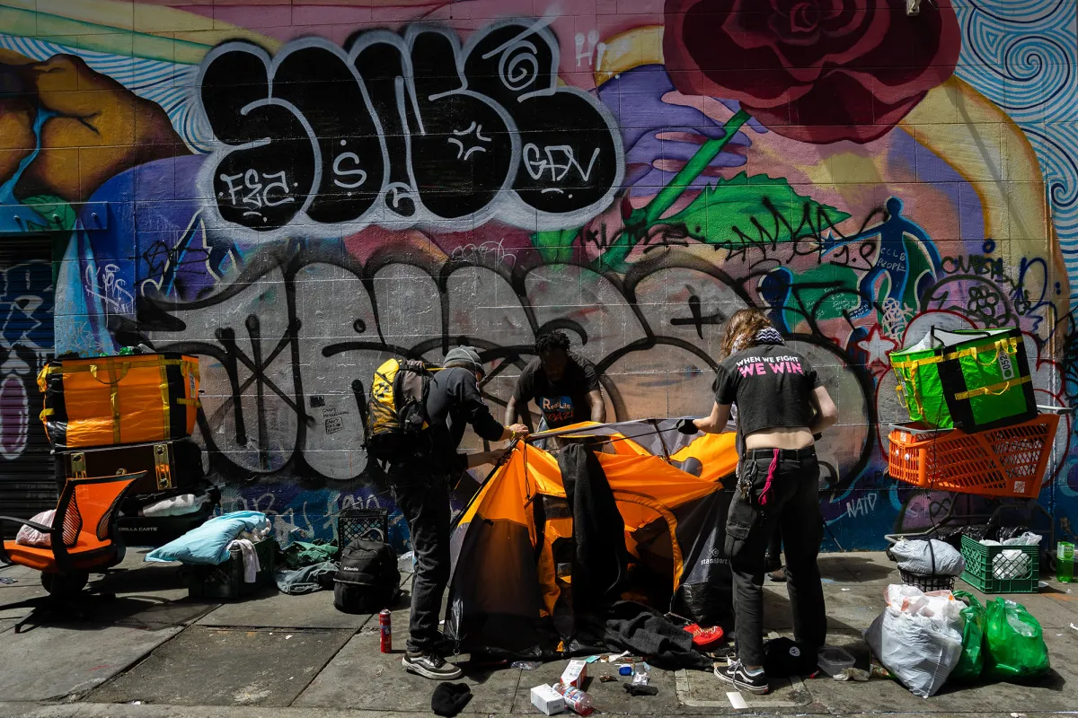 Michael Johnson takes down his tent in downtown San Francisco with the help of activists on Aug. 9, 2024. Photo by Manuel Orbegozo for CalMatters