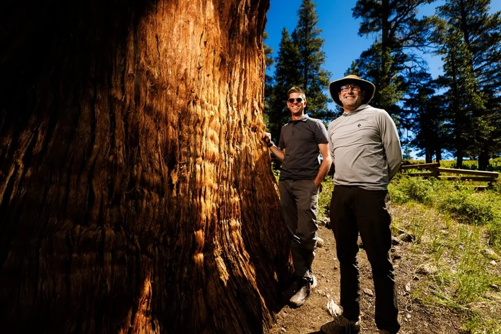 Matt Ritter (L) and Michael Kauffmann (R) visit the world’s largest juniper in the Sierra Nevada, California. Photo by Joe Johnston/University Photographer/Cal Poly 7-8-25.