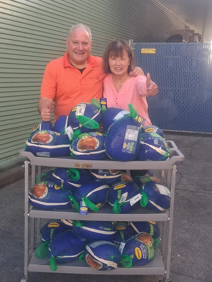 Eureka Rotarian Matthew Owen and Betty Chinn pose with a bunch of turkeys. | Photo: Betty Kwan Chinn Foundation