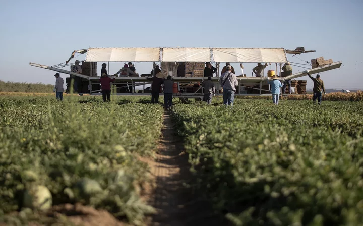 Farmworkers harvest melons behind a tractor on a melon farm outside of Firebaugh on Sept. 11, 2025 | Photos: Larry Valenzuela, CalMatters