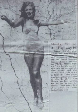 The next morning the Horace Heidt suggestion was the peg for a front page story accompanied by a picture of the curvaceous actress superimposed on a map of the Redwood Highway. Readers were told that we’d forwarded the idea to Miss Monroe and that we awaited her response — breathlessly.