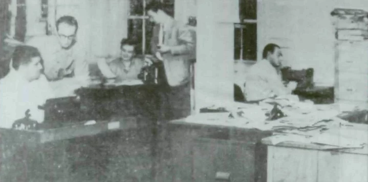 Above: Humboldt Times newsroom, 1954. Seated at desk are managing editor Elmer “Hodge” Hodgkinson at left, and Andrew Genzoli, county editor and noted local historian. In the background, from left, are Q. L. Wilson, in charge of the Times’ Arcata news bureau; Walter Johnston, general news reporter; and the author, then a staff writer. Photos via the Humboldt Historian.