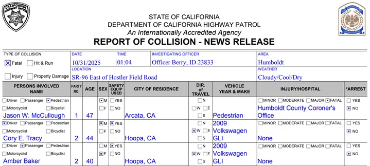 On 10/31/2025, at approximately 0104 hours, the CHP Humboldt Communication Center (HCC) received a call of a vehicle versus pedestrian traffic crash on SR-96, east of Hostler Field Road. Based on CHP’s preliminary investigation, it was determined Cory Tracy was driving a 2009 Volkswagen GLI westbound on SR-96, east of Hostler Field Road. For an unknown reason, Jason McCullough was walking within the westbound lane of SR-96, and a crash occurred between the Volkswagen and Mr. McCullough. As a result of the crash, Mr. McCullough sustained fatal injuries. Mr. Tracy was evaluated for drug and/or alcohol impairment and was determined not to be impaired. Whether Mr. McCullough was under the influence of drugs and/or alcohol at the time of the crash remains under investigation.