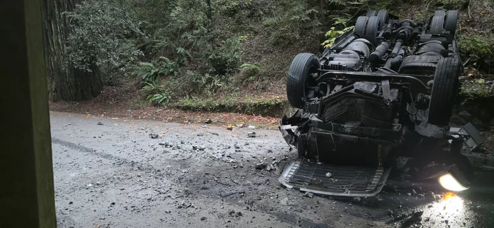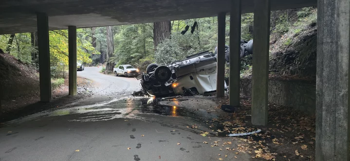 On October 19th, 2025, at 1713 hours, Humboldt Communications Center notified CHP units of a solo vehicle crash on US-101, in Richardson Grove. A semi tractor without a trailer, was traveling on US-101 when, for reasons still under investigation, the semi tractor drove off the roadway collided with the barrier of the bridge just south of the entrance to Richardson Grove State Park. The semi tractor travelled off the bridge and landed on its roof, beneath US-101. The driver, Juan Herrera Garcia (75), was uninjured and DUI was not a factor in this crash. US-101 was closed for approximately 30 minutes as a result of this crash. Fluids from the engine of the semi tractor leaked from the vehicle onto the roadway below. Mitigation measures were placed, and State Parks is overseeing the cleanup efforts within the State Park.