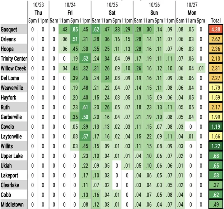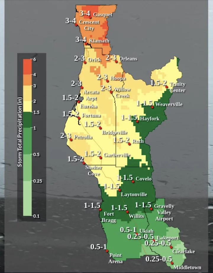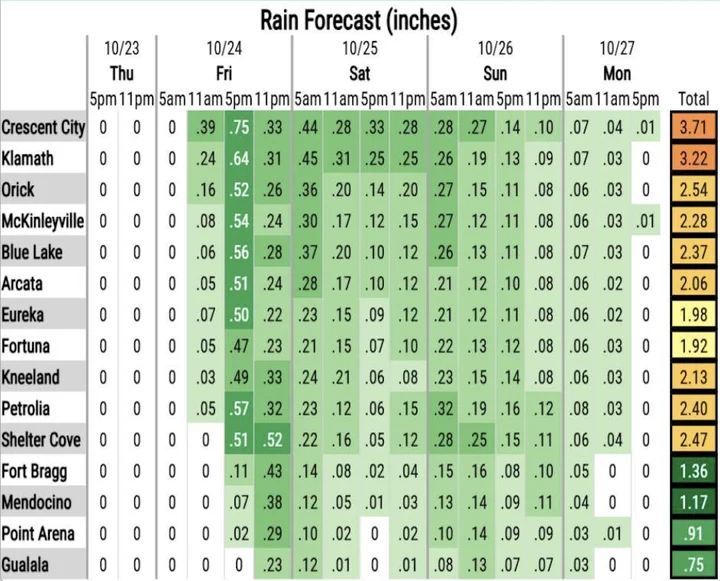 Starting Friday night and continuing through Sunday before petering out Monday, heavy precipitation is expected from Del Norte all the way down to Lake County with northern Humboldt expected to receive the storm’s brunt. The NWS posted a series of handy graphics to help you wrap your head around this thing: