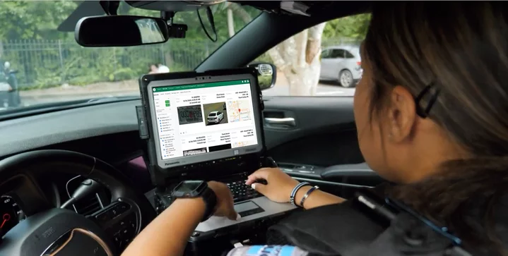 A law enforcement officer accesses ALPR data from her patrol vehicle. | Photo courtesy Flock Safety.