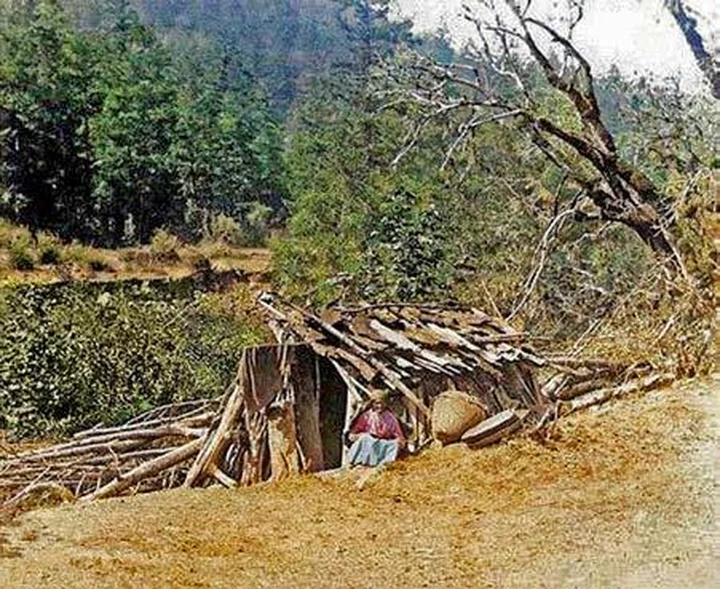 Mawenok traditional house, 1906. The unidentified woman out front is probably Betsey Maple. Photo: Pliny Goddard, via the Hearst Museum of Anthropology. Colorized by the author.