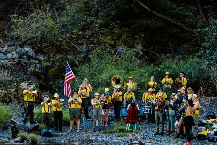 The Cal Poly Marching Lumberjacks playing the National Anthem and much more near the finish line on the banks of the Trinity River, day two Nationals Head-To-Head races. Juliana Dean Photography