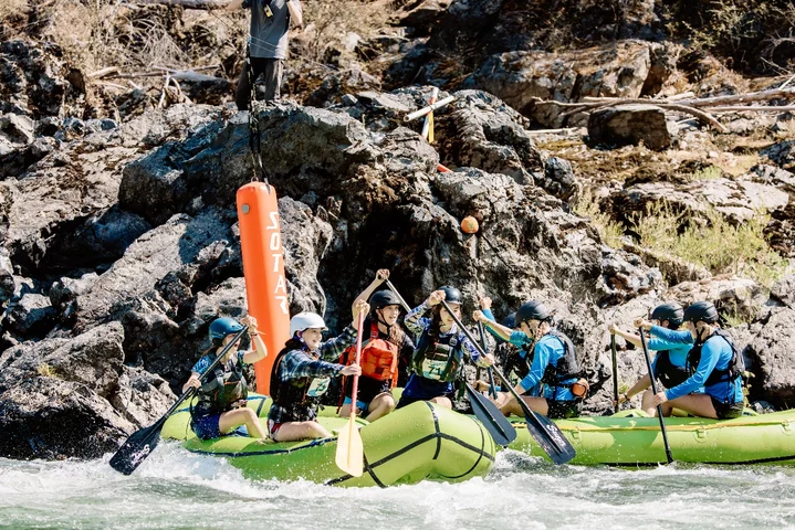 On day three, the final race was Slalom at Sailors Bar — the most technical race of the weekend. Teams had to navigate through whitewater and a dizzying maze of 11 gates, formed by pairs of poles slightly wider than the raft that dangle from river-spanning ropes. I helped build this course and it was no small feat erecting 300 ft-long highlines until just days before the race. I came to appreciate Neal Guthrie’s rope skills as we set highlines by adapting gear and methods he used to climb and haul equipment up walls in Yosemite. All our anchors were temporary and constructed out of tree-friendly soft tubular webbing. Some gates were placed in precarious locations with powerful hydraulics that can instantly flip a raft (some did) after a wrong move so split-second team decisions and paddling finesse define this race. To add to the challenge, four gates required teams to pass through the gate against the current—literally paddling upstream in whitewater! Namely, Gate 10 was a crowd favorite because it forced teams to paddle upstream, then get sucked directly into a “hole” that surfs the raft across the river and spits it out on the other side of the gate. To clear a gate, all four paddlers had to pass through in the correct direction without touching the poles. Each team had two timed runs, scored on speed, the number of gates cleared. Points were also subtracted if a gate was touched.