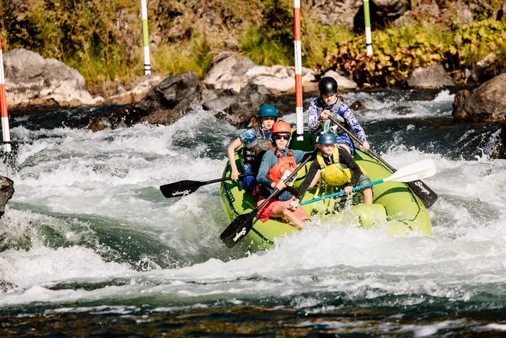 Redwood Rafters Cadet Mixed team taking on the11-gate Slalom course: Kiera McIver, Alia Collins, Jameson Wolf, and Zane Garwood. Juliana Dean Photography