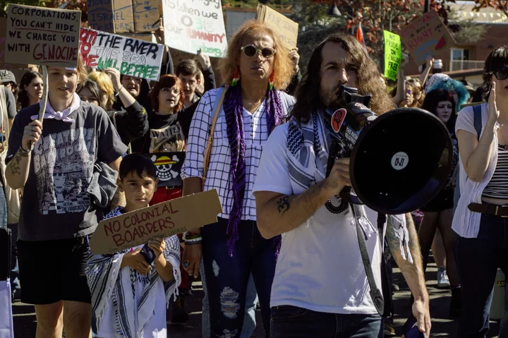 Toledo leading the Oct. 7 march that got him in hot water with Cal Poly Humboldt.