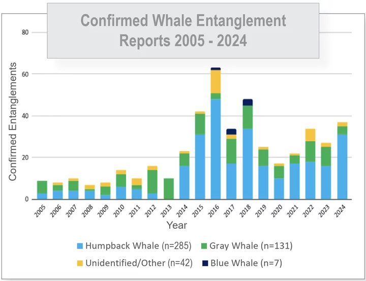 The phenomenon, which was likely tied to human-caused climate change, had serious impacts on the marine ecosystem, causing toxic algae to multiply while altering whale migration patterns, among other effects. In 2016 there was a record number of whale entanglements in fishing gear off the West Coast, and while the rate declined for a few years, the frequency remains elevated, as shown in the chart below.