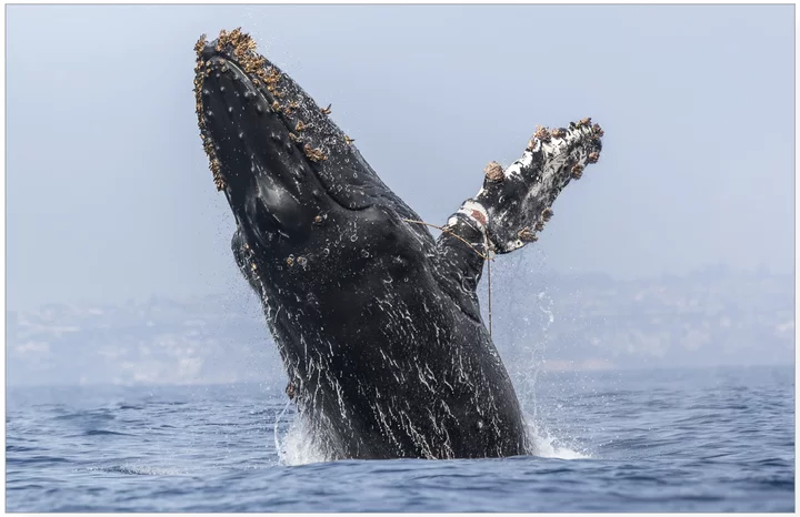 A breaching humpback whale entangled with line through the mouth, around the right pectoral flipper and trailing along its body. The whale was documented off Laguna Beach. | Photo: Delaney Trowbridge Photography, via NOAA.