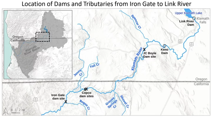 Map of the Klamath River and tributaries showing the location of the four removed hydroelectric dams.
