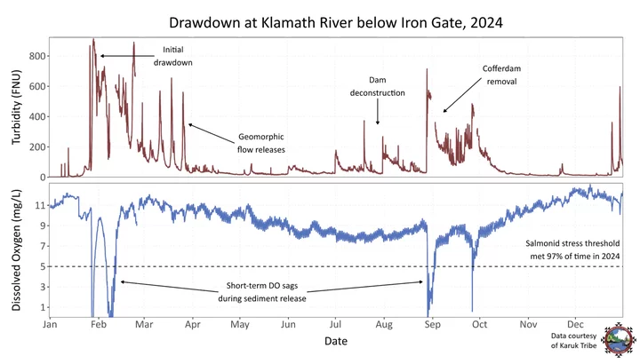 Toz Soto, senior policy and research advisor for the Karuk Tribe, said the drawdown was scheduled for last winter to minimize impacts, and while there was a spike in turbidity immediately after the last cofferdam was removed, the water quality quickly recovered.