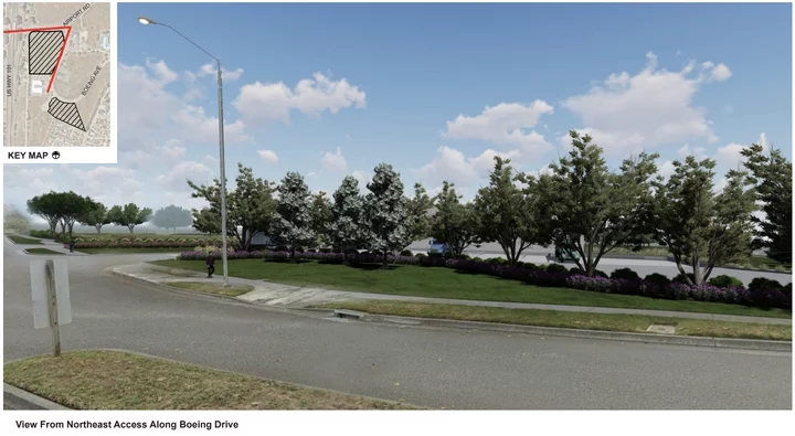 So, what will the place look like once it’s built? Well, good news and bad news on that front. The good news? Panattoni did create visual renderings of the warehouse. The bad news? Those renderings have the building almost completely obscured by surrounding landscaping.