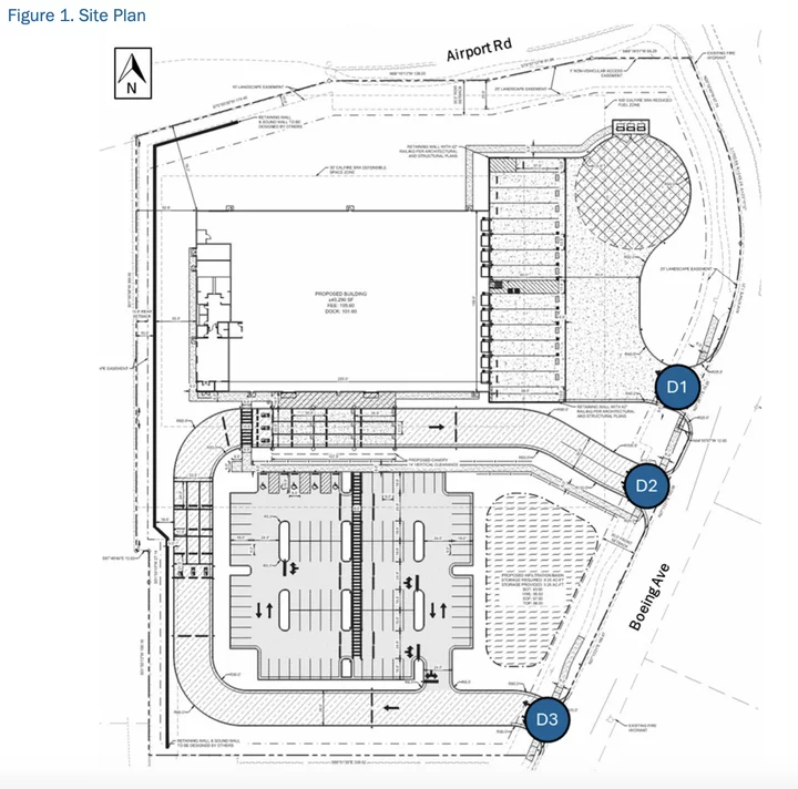 In all, there are six parcels incorporated into these plans, with a total project size of about 9.4 acres. Line-haul delivery trucks will access the warehouse via a driveway on Boeing Avenue, according to a project description prepared by the development company Panattoni.