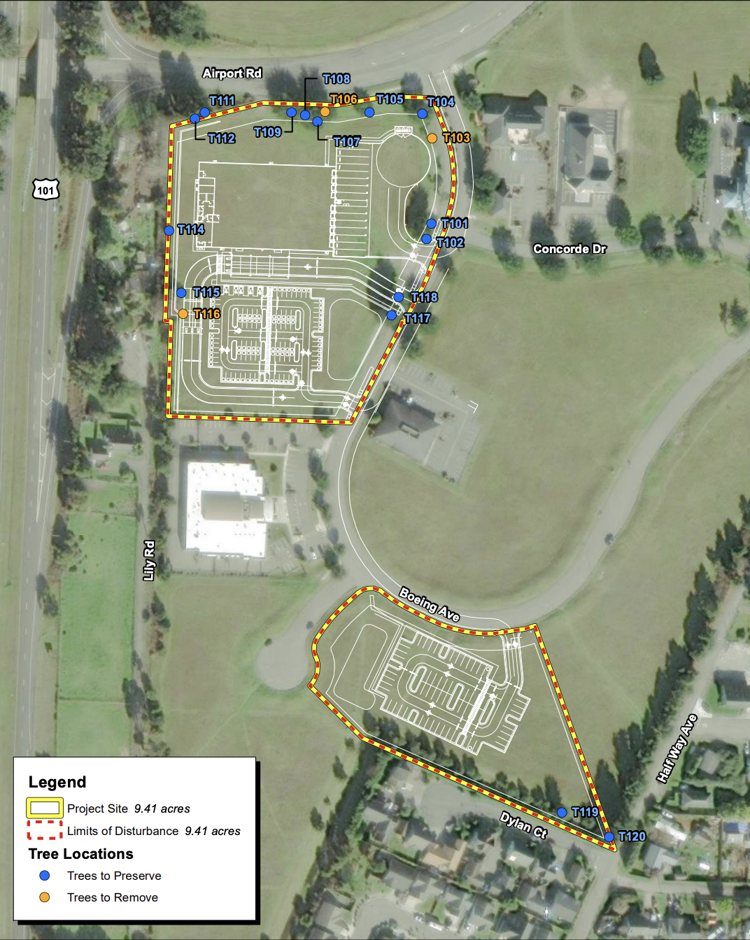 Schematic illustration shows the outline of an Amazon warehouse and two parking lots just off the freeway by the airport in McKinleyville. | Images via Humboldt County.
