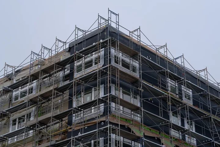 Scaffolding sits in front of a weather-resistant barrier on the exterior of factory-built housing, Drake Avenue Apartments, at 825 Drake Avenue in Marin City on Feb. 7, 2026. Photo by Jungho Kim for CalMatters