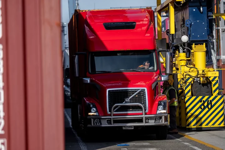 A truck driver prepares to leave after receiving a shipping container at Yusen Terminals at the Port of Los Angeles in San Pedro on Feb. 11, 2025. Photo by Joel Angel Juarez for CalMatters