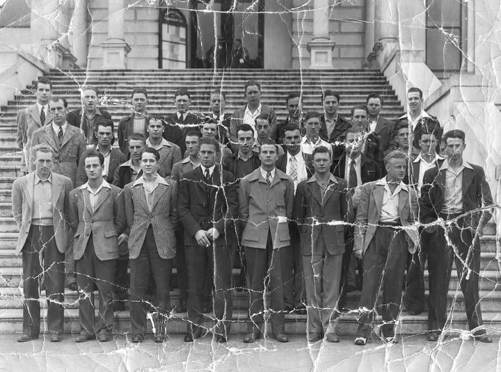 Standing on the steps of the Humboldt County Courthouse, these young Humboldt men have all been inducted into the military on a single day in 1942, following the attack on Pearl Harbor. Phillip died in Humboldt at age 53 from residual complications of meningitis which he contracted during the war. Photos via the Humboldt Historian.