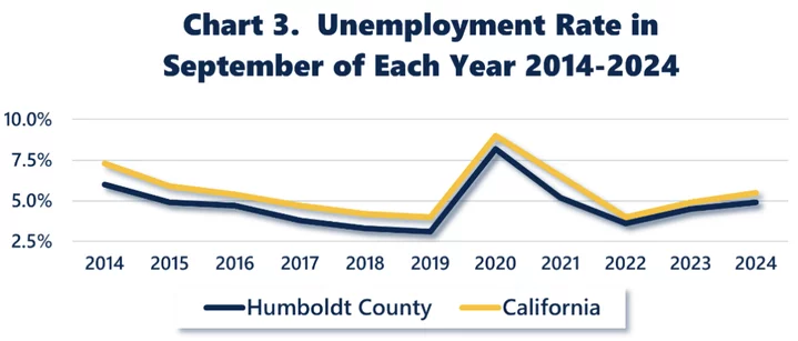 - A disproportionately high percentage of workers in Humboldt County work full-time, year-round, yet live in poverty. In 2014, this rate in Humboldt County was slightly lower than the statewide average, 3.5% versus 3.6%. In 2024, however, the statewide figure decreased to just 2.2%, while in Humboldt County it rose significantly to 6.2%.