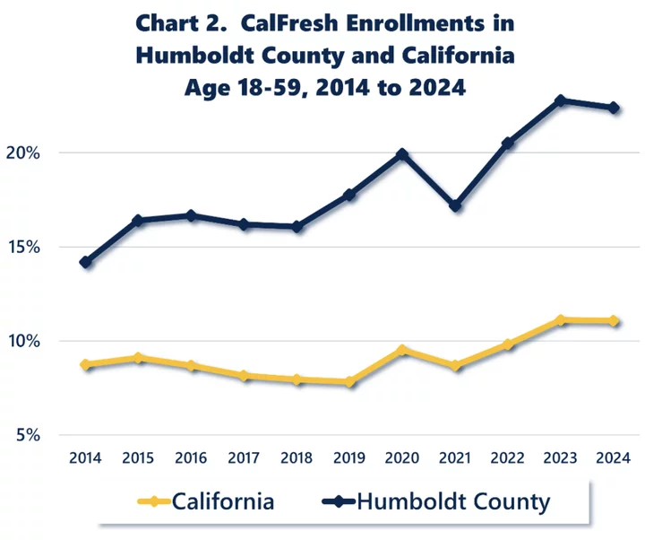 - Back in 2014, Humboldt County had the 16th-highest enrollment rate for working-age adults; by 2024 we ranked 5th, with more than 1 in 5 (22.4%) of our residents age 18 to 59 enrolled in CalFresh.