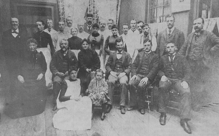 The dining room of the Revere Hotel was the scene of this photo taken about 1892, according to the late H. J. Kramer. Included in the photo are a Mrs. Sanders, George Kramer, Alice Kramer, Ed Kramer, Clarence Kramer and Ralph Kramer. In the front row. Nurse Tata is shown with little “Herbie” at the age of about four.