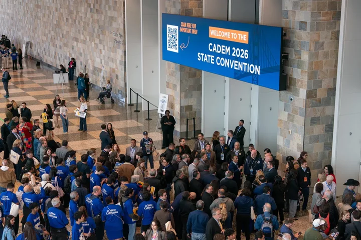 Attendees wait for the opening of the afternoon general session during the California Democratic Party convention at Moscone West in San Francisco on Feb. 21, 2026. Photo by Jungho Kim for CalMatters