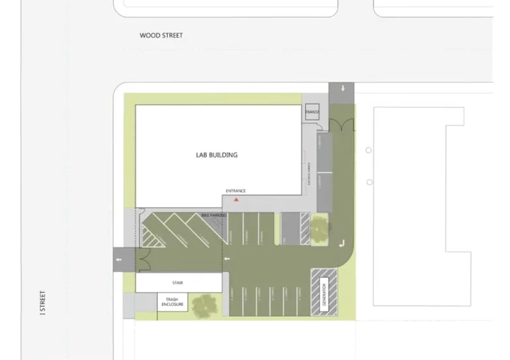 An overhead view of the site plan shows the 90-degree orientation of the upstairs lab facility with a ground-level driveway and parking spots.