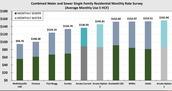 Right now the average single-family household in Arcata pays $136.93 monthly for their water and wastewater usage. In 2030, they’ll pay an average of $145.81 if the rate increase goes into effect. The proposed rates are comparable with the area average.
