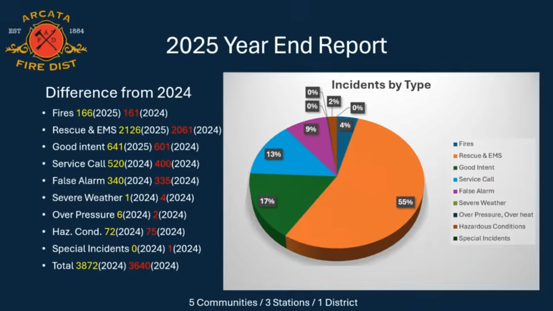 The Arcata Fire District’s chief Chris Emmons and APD’s chief Chris Ortega both shared some statistics with the council that detailed their department’s efficacy last year. It’s a lot of information to condense into words, so here are two GIFs made from their presentations. You may need to click on them work.