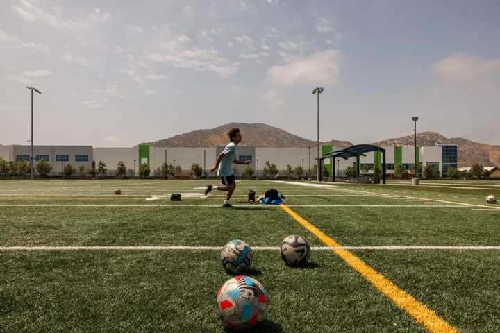 An athlete plays soccer at a public soccer field surrounded by warehouses and smog in Jurupa Valley, on June 3, 2025. Photo by Elisa Ferrari for CalMatters