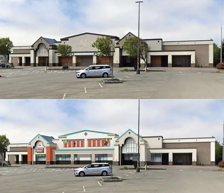 The former Ray’s Food Place before (above) and after (below) proposed new signage. Ten new signs are proposed for the east and north walls of this 45,000-square-foot building, which sits on a 5.32-acre parcel. | From the Planning Commission’s agenda packet.