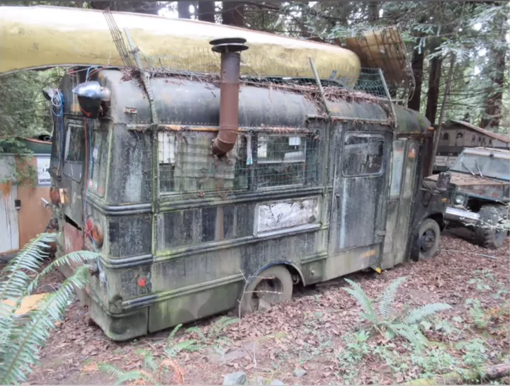 A stovepipe chimney emerges from hog-wire fencing in the window of a modified vehicle on the Yee Haw property. | Photo provided by county staff in September 2024.