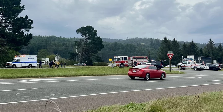 AI SUMMARY: At 4 p.m., a black truck, newer model, collided with a black sedan at the intersection of Highway 101 and Bayside Cutoff. The caller reported that emergency services were on their way. One of the vehicles was blocking traffic. Emergency responders were already dispatched to the scene. Traffic was backed up to Bracut, and a tow truck was requested for a Toyota Prius with major front-end damage. J&M Towing was called for rotation services.