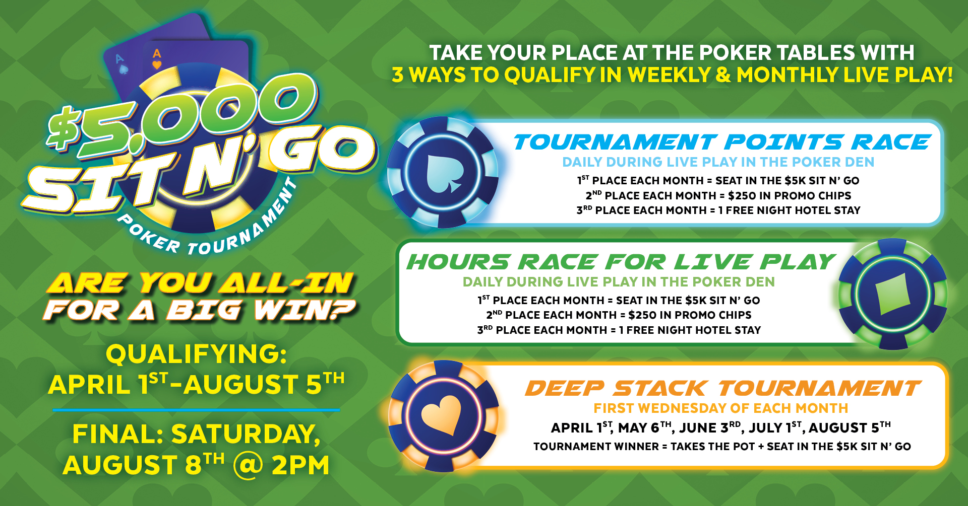 In both the Tournament Points Race and the Hours Race for Live Play, earn daily during live play in the Poker Den. Each month, 1st place wins a seat in the $5,000 Sit N’ Go, 2nd place receives $250 in promo chips, and 3rd place wins a free night hotel stay. The Monthly Deep Stack Tournament takes place the first Wednesday of each month — April 1st, May 6th, June 3rd, July 1st, and August 5th — where the tournament winner takes the pot plus a seat in the $5,000 Sit N’ Go. With thousands in prizes and multiple ways to qualify, there’s never been a better time to take your seat at Bear River Casino Resort!