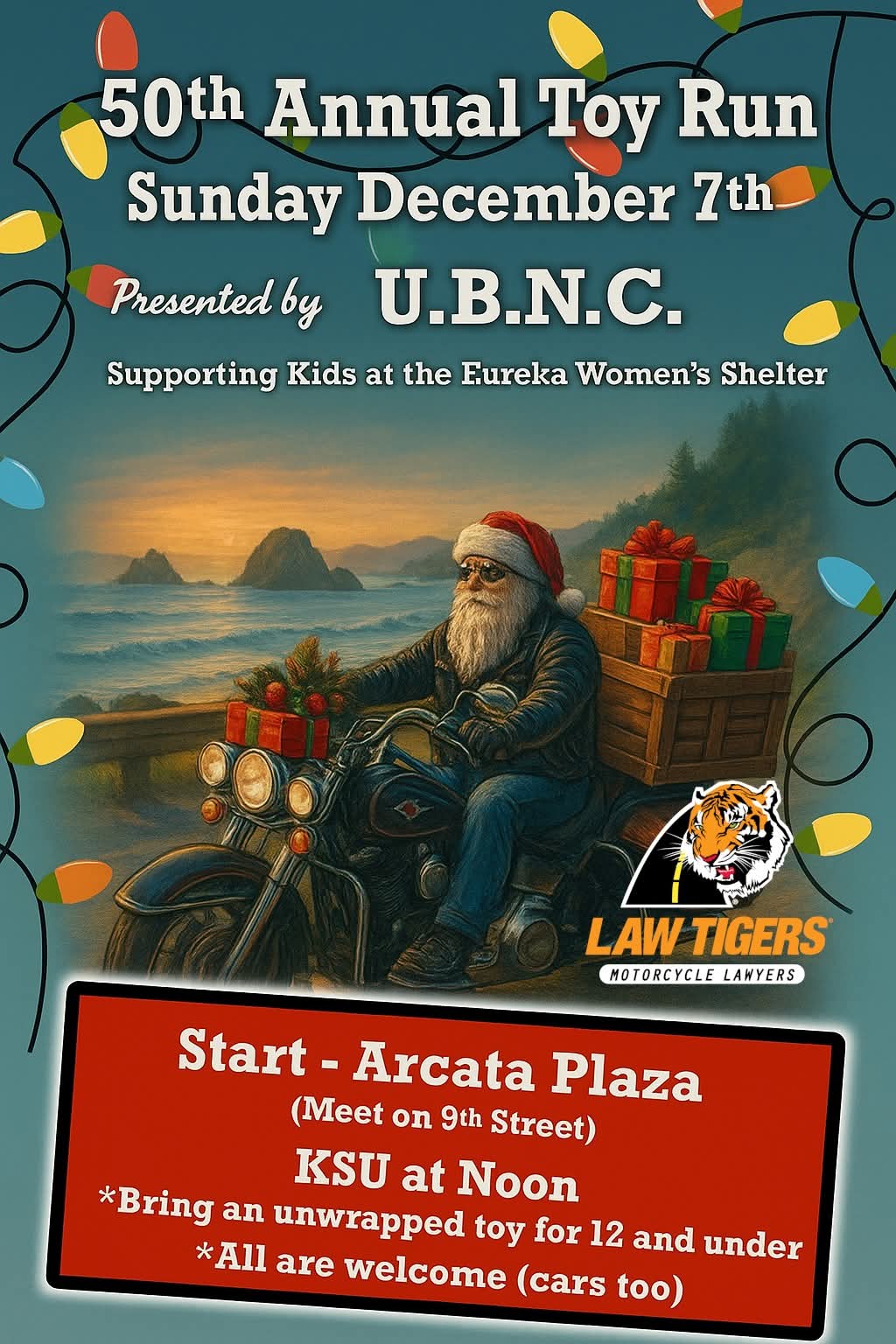 The United Bikers of Northern California is very proud to announce our 50th annual Toy Run. We meet at the Arcata Plaza with kickstand up at noon, and we ride to the Eureka Vet’s hall where we deliver the new, unwrapped toys. There will be a spaghetti feed at the Vet’s hall. Everything we collect will go to the Eureka Womens shelter and will be handed out a few days before Christmas. This year has been particularly hard on many families in our area, please join us and help make Christmas a special time for the youth in our community!
