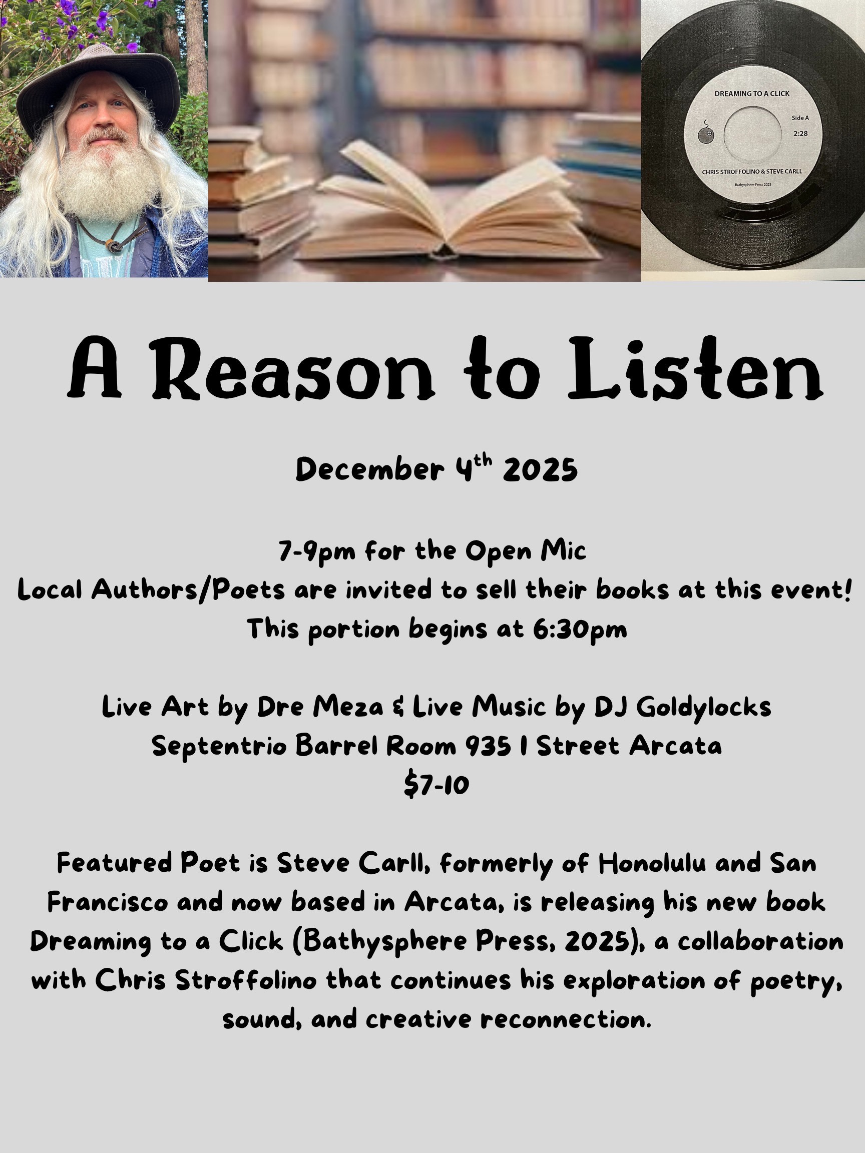 The next A Reason to Listen, Humboldt’s longest-running live poetry event, is happening Thursday, December 4 at 7pm at Septentrio’s Barrel Room in Arcata (935 I Street). The featured Poet will be Steve Carll, for the release of his new book of poems, Dreaming for a Click. Special guests include DJ Goldylocks, and Live Art with Dre Meza! The open mic is available to the public and sign ups begin at 6:30pm, along with a book fair where poets can sell their book and chapbooks. The show starts at 7pm. Copies of Carll’s book will also be available for purchase and signing. Cash or Venmo only for the door and book purchases.