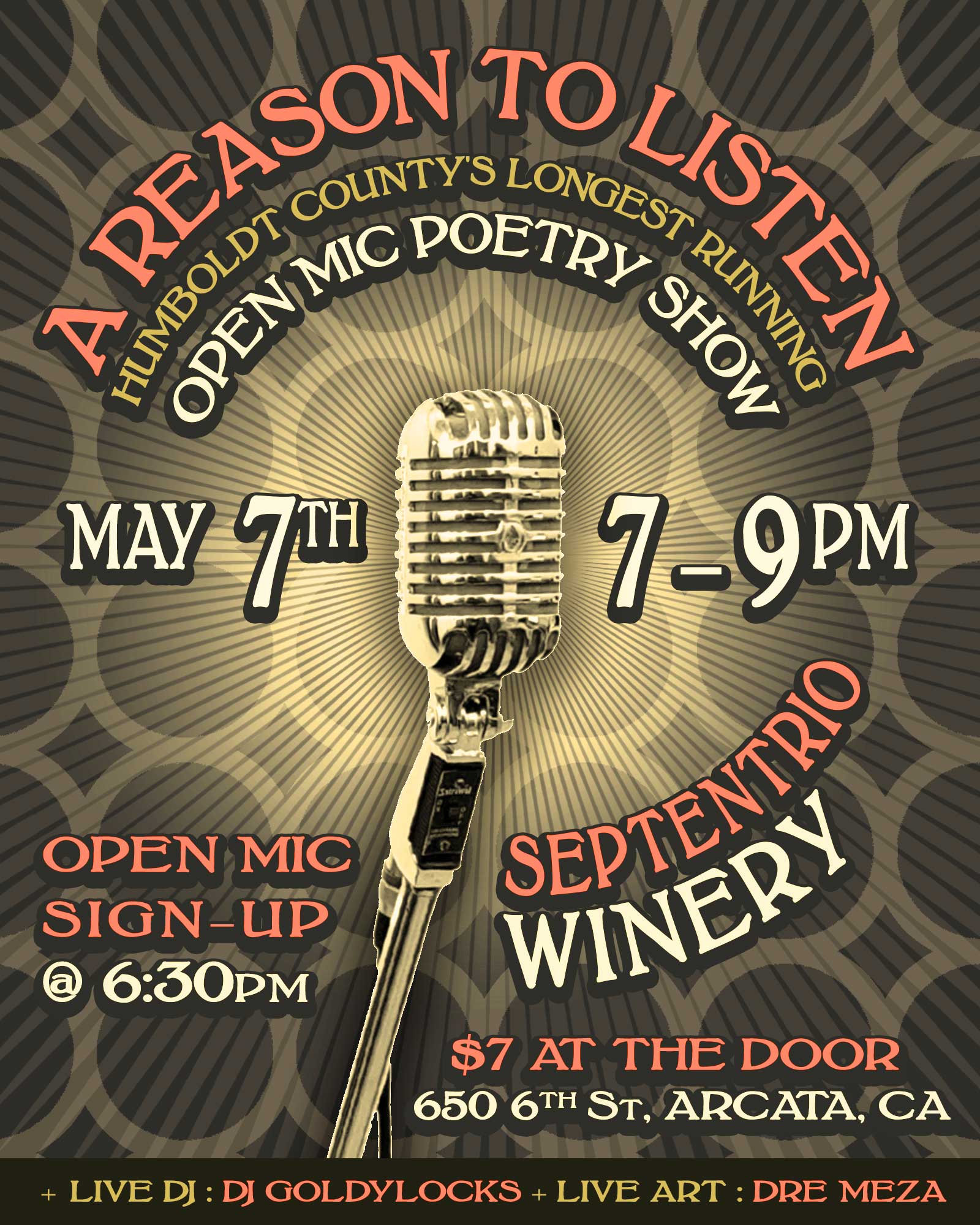 The next A Reason to Listen, Humboldt’s longest-running live poetry event, is moving from Septentrio’s Barrel Room to Septentrio’s Winery Warehouse in Arcata (650 6th Street). The next show will be happening Thursday, May 7 at 7pm. Sign-ups for the open mike will begin at 6:30 pm. Live music by the amazing DJ Goldylocks. Live art by the inimitable Dre Meza. The cover is a sliding $7-10 at the door: cash or Venmo.